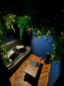 店内には優雅の中に荒々しく生い茂る木々と頭上に光り輝く月と星空達が皆様のチル空間を演出します。ソファー席に加え、個室席をご用意しております。