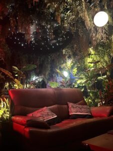 店内には優雅の中に荒々しく生い茂る木々と頭上に光り輝く月と星空達が皆様のチル空間を演出します。ソファー席に加え、個室席をご用意しております。