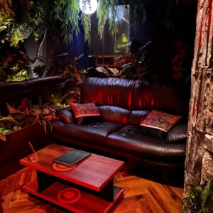 店内には優雅の中に荒々しく生い茂る木々と頭上に光り輝く月と星空達が皆様のチル空間を演出します。ソファー席に加え、個室席をご用意しております。